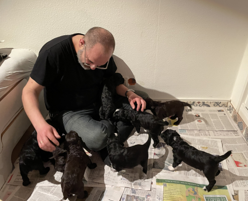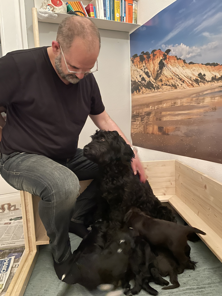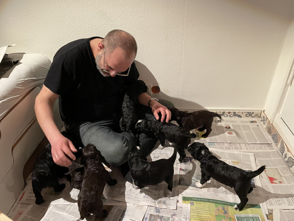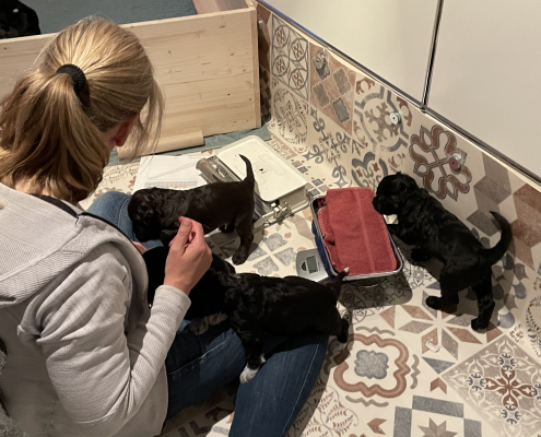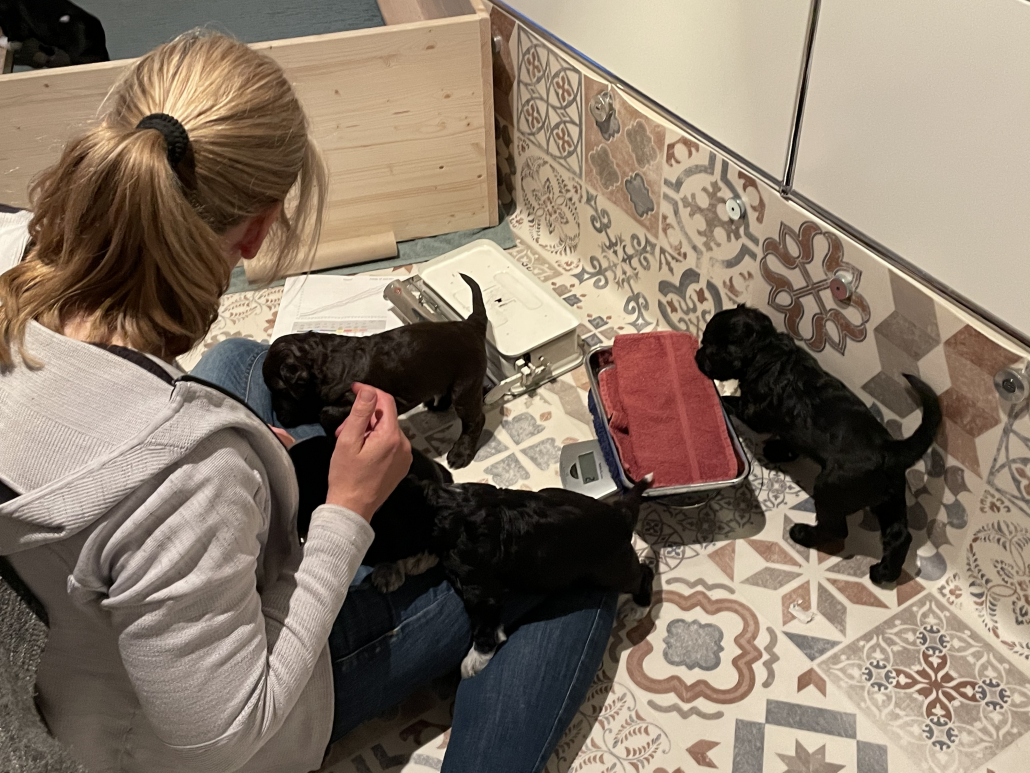 Zufüttern klappt zum Glück gut! Offensichtlich vertragen sie alle das Futter (mit Wasser eingeweichtes Welpenfutter und Welpenersatzmilch), und sie scheinen es tatsächlich auch zu mögen. Den irritierten Blick von Lola, wenn ich den Napf reinbringe, könnte man fast so interpretieren als dass sie sich wundert nicht mehr so gebraucht zu werden. Aber wenn Lola-Mutter dann wieder dazukommt ist die Aufregung trotzdem noch groß und es wird um den besten Milchbar-Platz gewetteifert.
