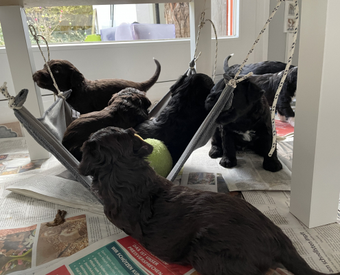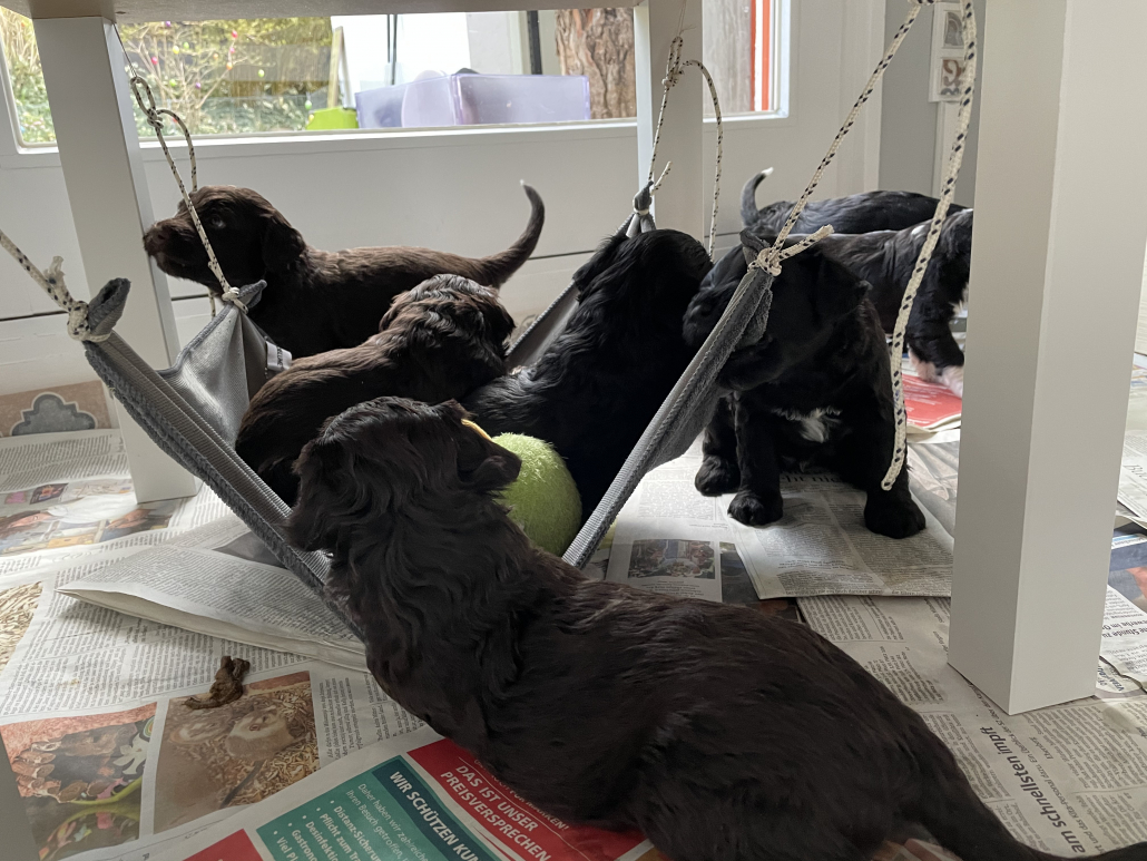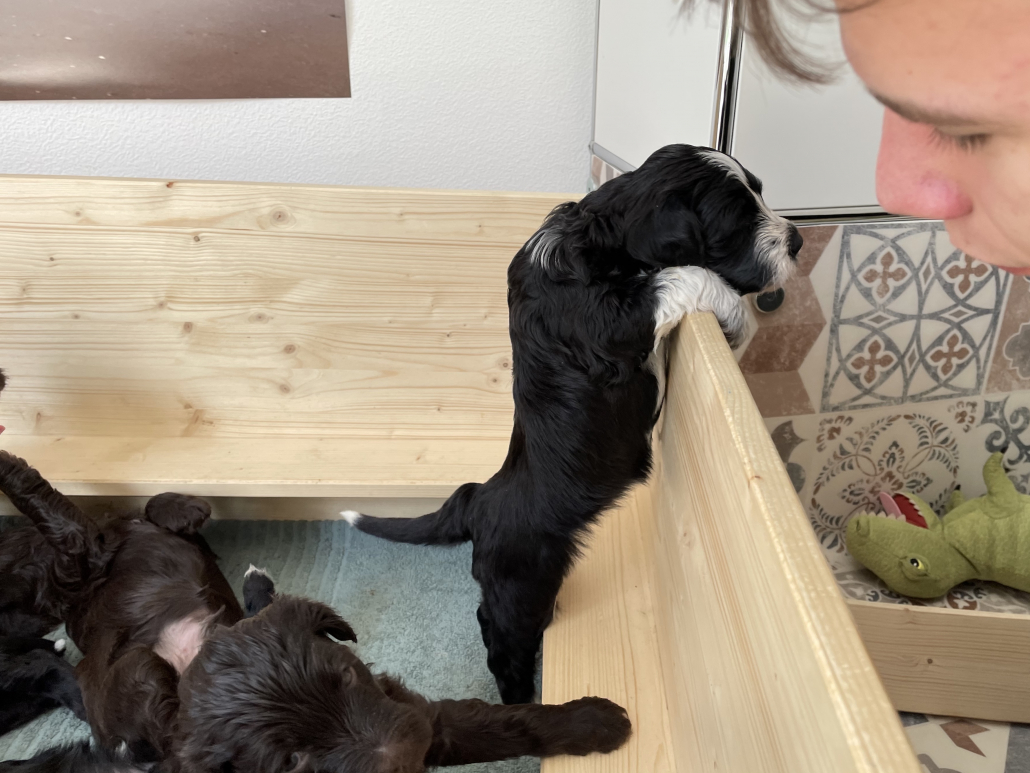 Wir haben jetzt das Auslaufareal erneut vergrößert, sie dürfen sich jetzt im ganzen Zimmer frei bewegen, an der Zimmertür haben wir ein Türgitter angebracht. Sie sind tagsüber auch häufiger wach und genießen ihren größeren Freiraum mit tollpatschigem Rennen, Torkeln, Ausrutschen (Driften) und Umherwackeln. Das Spielen miteinander klingt schon machmal wie eine kleine Rauferei – klar, bei den immer mehr werden spitzen Zähnen muss man sich auch zur Wehr setzten wenn einem in den Schwanz gebissen wird.