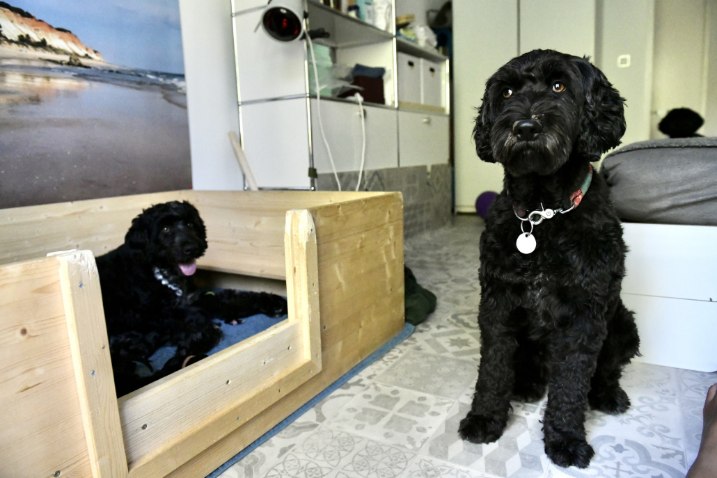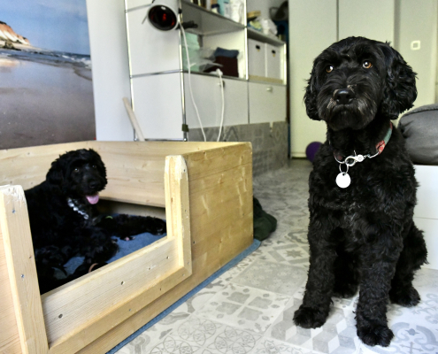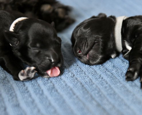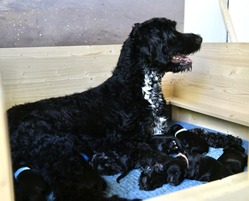 Interessant und neu für uns ist die Situation, dass wir neben der Mutterhündin ja auch noch zwei andere Hunde haben. Wie werden die auf diese neue Situation reagieren? Wir haben zum Glück den Komfort, dass unser Sohn jederzeit und gerne unsere Lola und unseren Hannibal zu sich nimmt. So haben wir das auch bei der Heimkunft nach dem Kaiserschnitt gehandhabt, so dass Greta vor jedem weiteren potentiellen Stress bewahrt blieb. Am folgenden Tag aber wagten wir ein erstes Zusammentreffen. Es war unglaublich interessant zu beobachten: Die beiden haben uns bei der Begrüßung komplett ignoriert, weil die vorherrschenden und für uns Menschen nicht erkennbaren Gerüche sie vollkommen in den Bann gezogen hatten. Nachdem sie sich ein bisschen beruhigt hatten, durften sie vorsichtig zu Greta in das „Welpenzimmer“: Hannibal war sehr skeptisch und unsicher zurückhaltend und wagte sich nicht näher als 3-4 Meter heran. Lola fand das alles aber unglaublich spannend und ging neugierig forsch auf die Wurfkiste zu, worauf Greta mit einem leisen dezenten Geräusch ihr klar machte, dass sie eine gewisse Distanzwahrung erwartet!