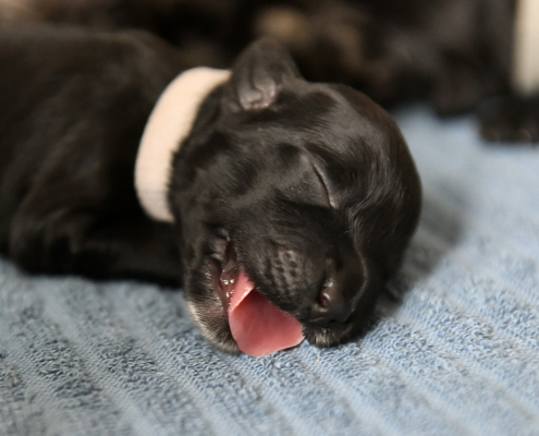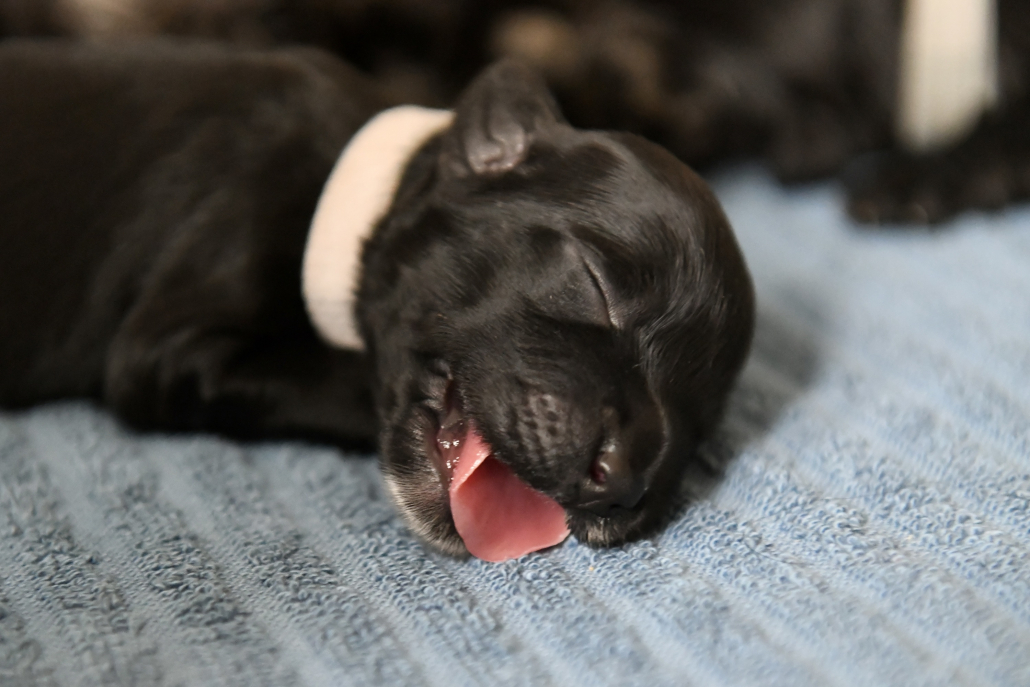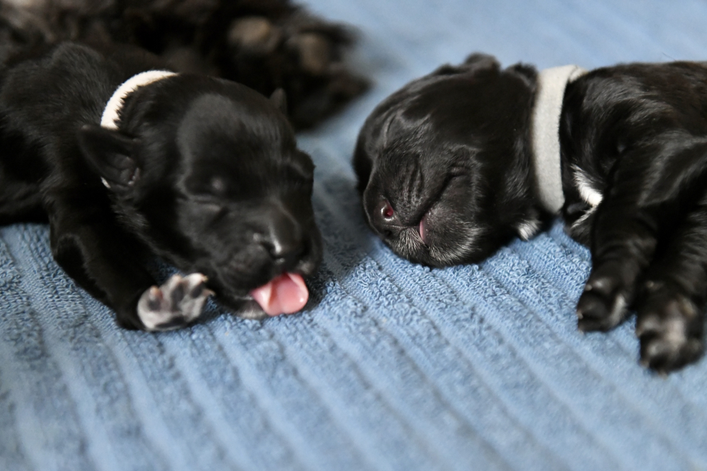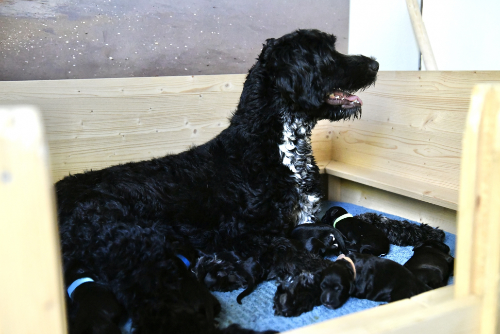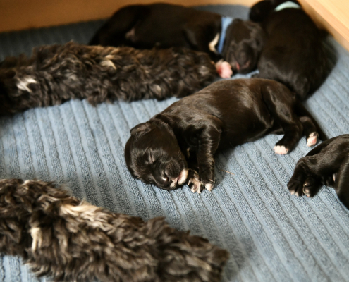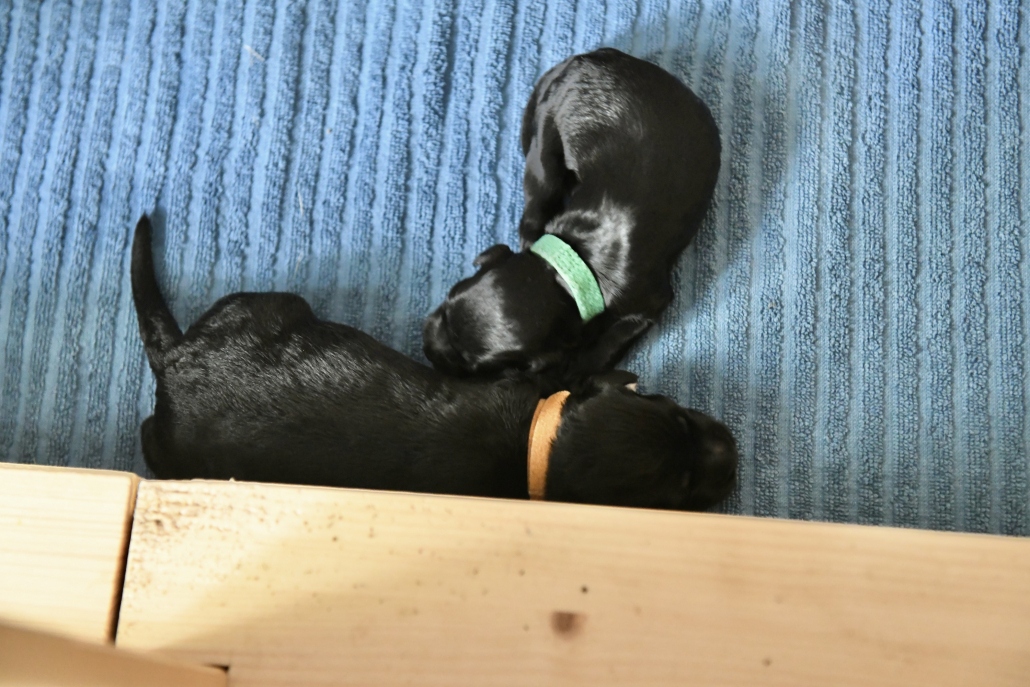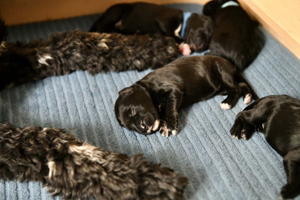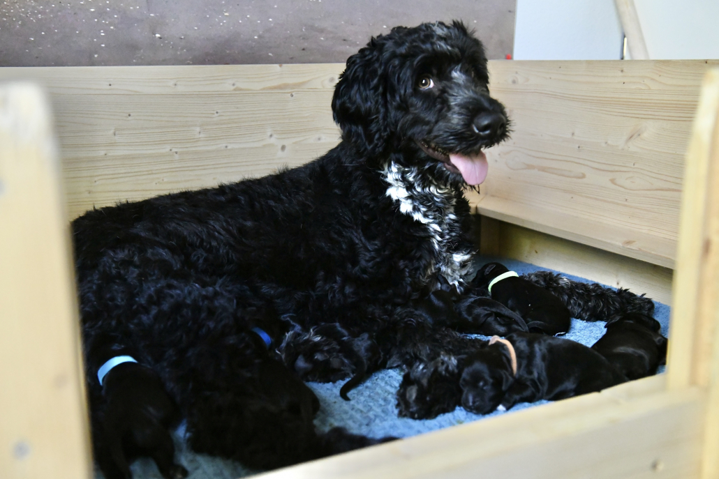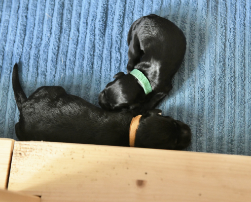 Greta ist eine sensationell gute Mutter – übrigens sind es 5 Weibchen und 6 Männchen 😉 Sie ist fast durchgehend in der Wurfkiste um ihren Babys zu jeder Zeit Milch anbieten zu können. Deswegen ist es auch so, dass meist KEIN Kampf aller 11 Welpen um die 6 bis 8 erreichbaren Zitzen stattfindet. Es liegen immer ein paar oder auch mehrere Welpen zufrieden am Rand und schlafen, während die anderen trinken. Nur um drei Welpen müssen wir uns noch ein bisschen intensiver kümmern, da sie uns von der Gewichtsentwicklung (wir wiegen ja täglich) noch leichte Sorgen machen, aber ich bin zuversichtlich!