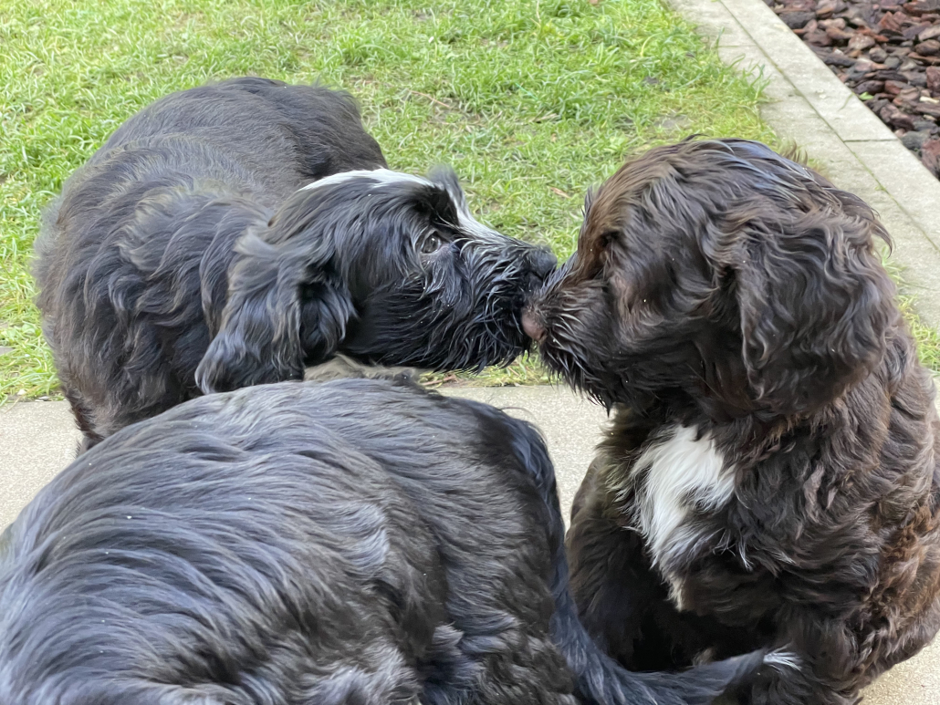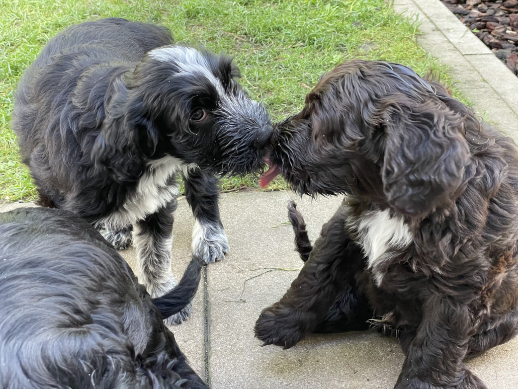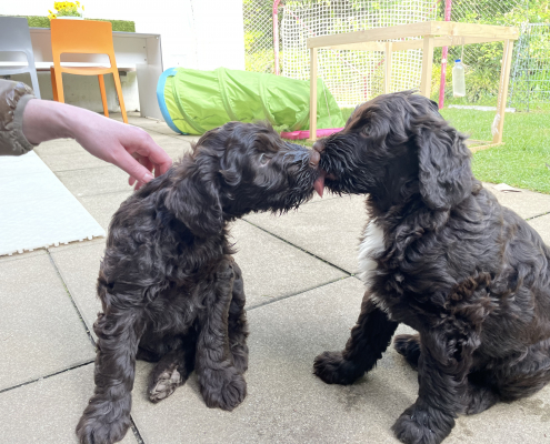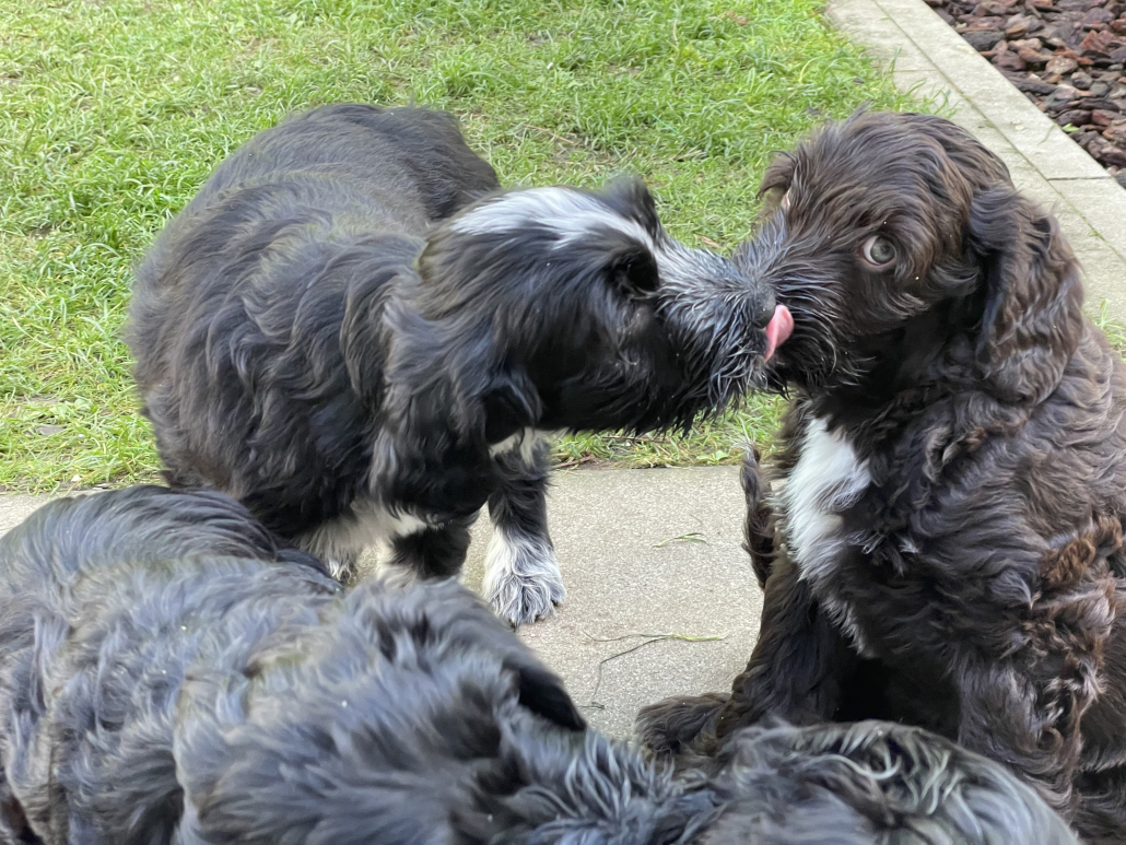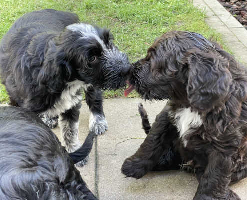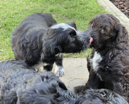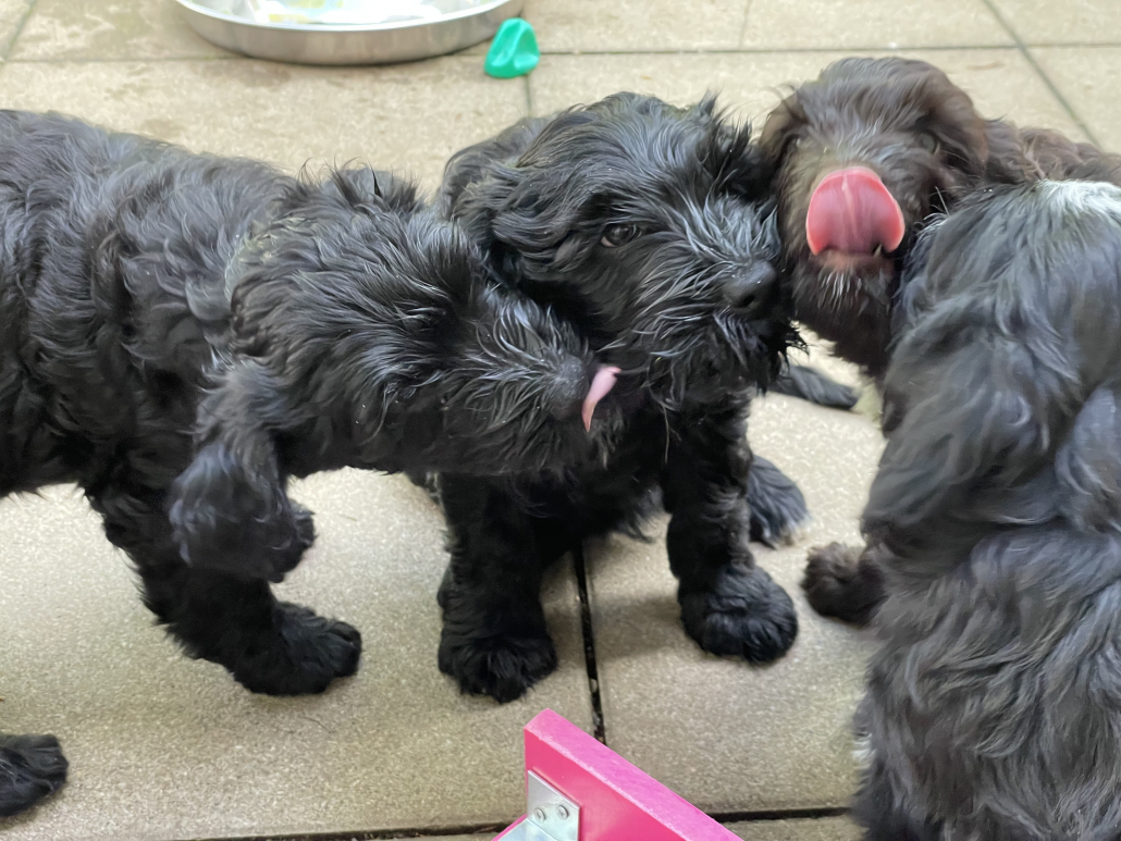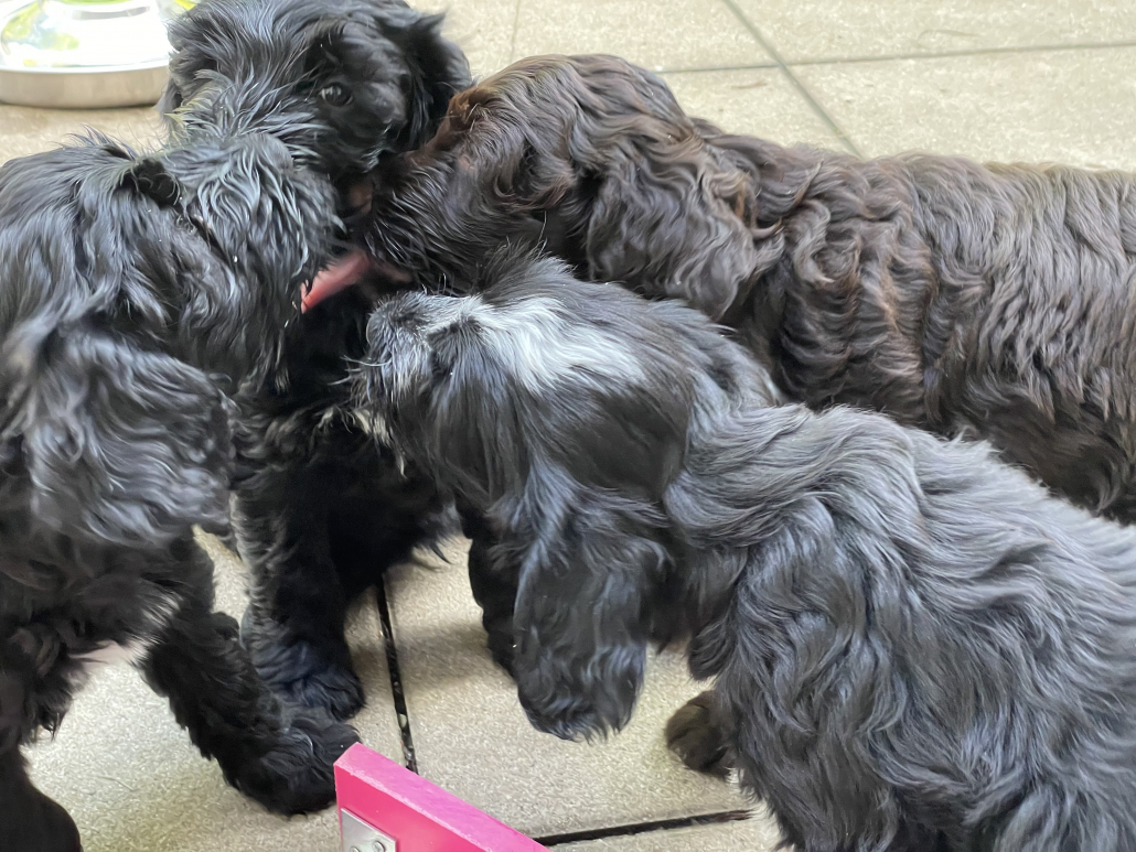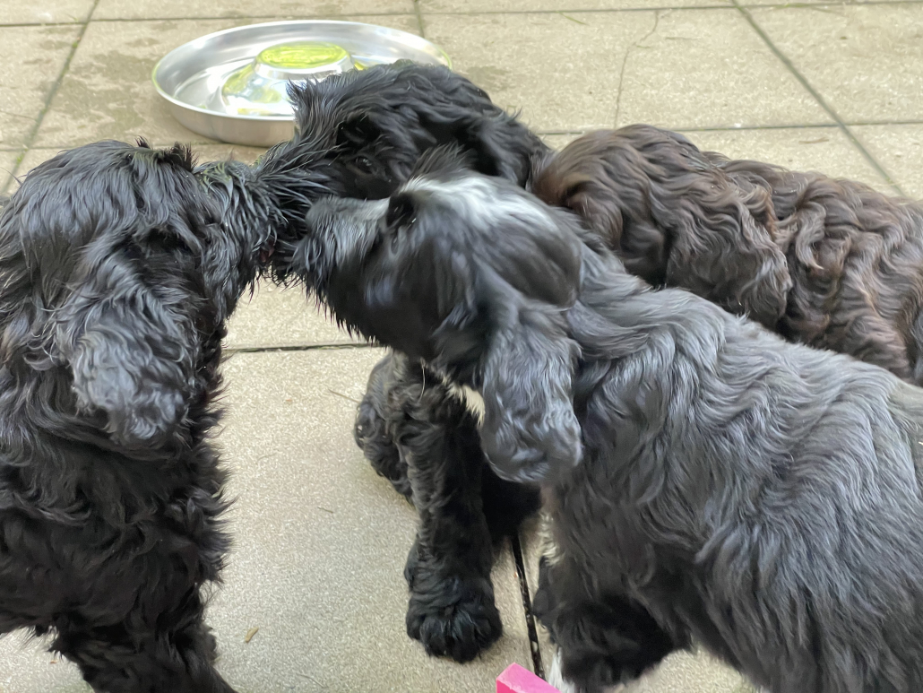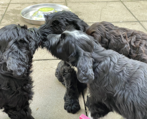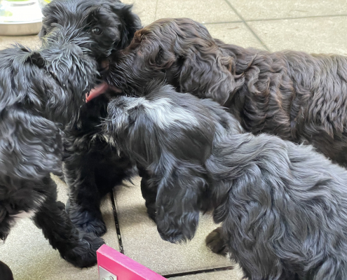 Bei den Fotos habe ich nochmal das „Gruppenschmusen“ eingefangen. Nach dem Essen lecken sie sich gegenseitig immer ab – goldig! Das Filmchen zeigt einen Ausschnitt aus den Alltag von acht Wochen alten Welpen im Garten.