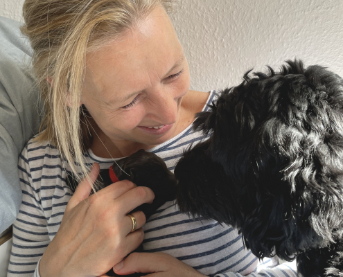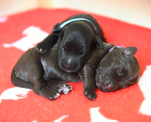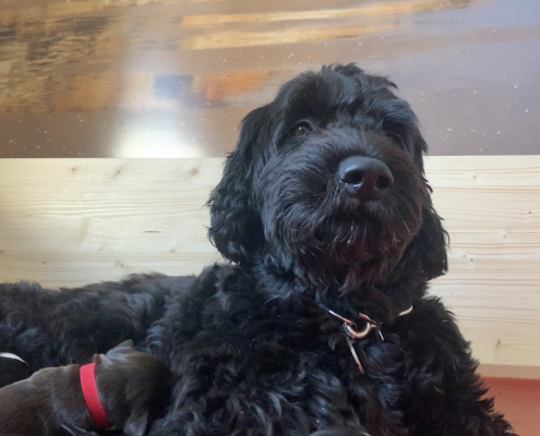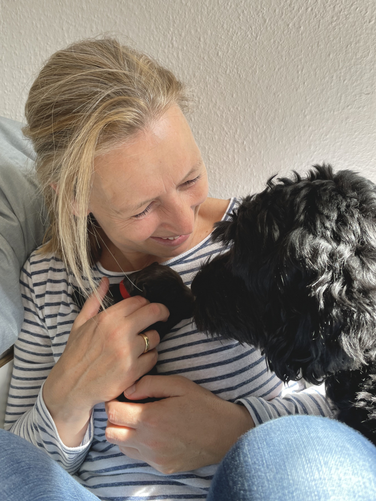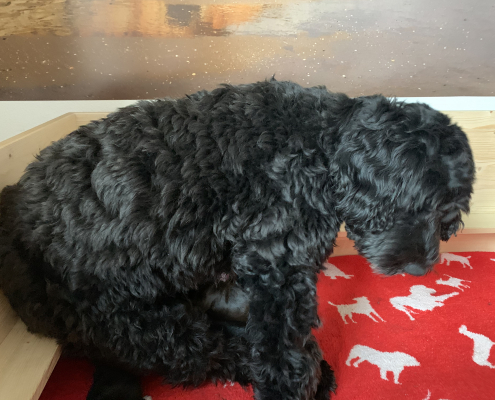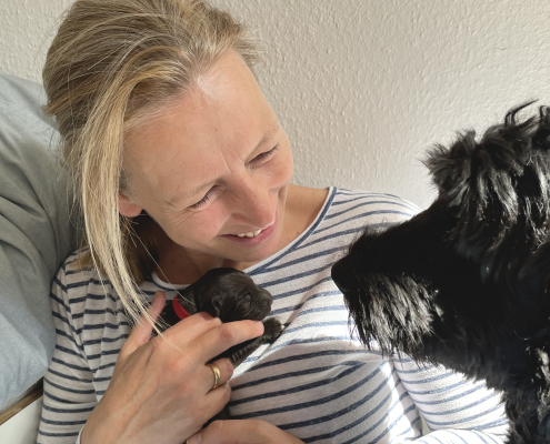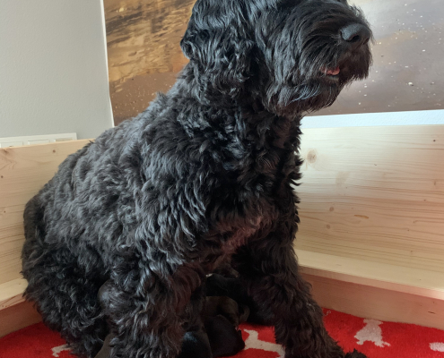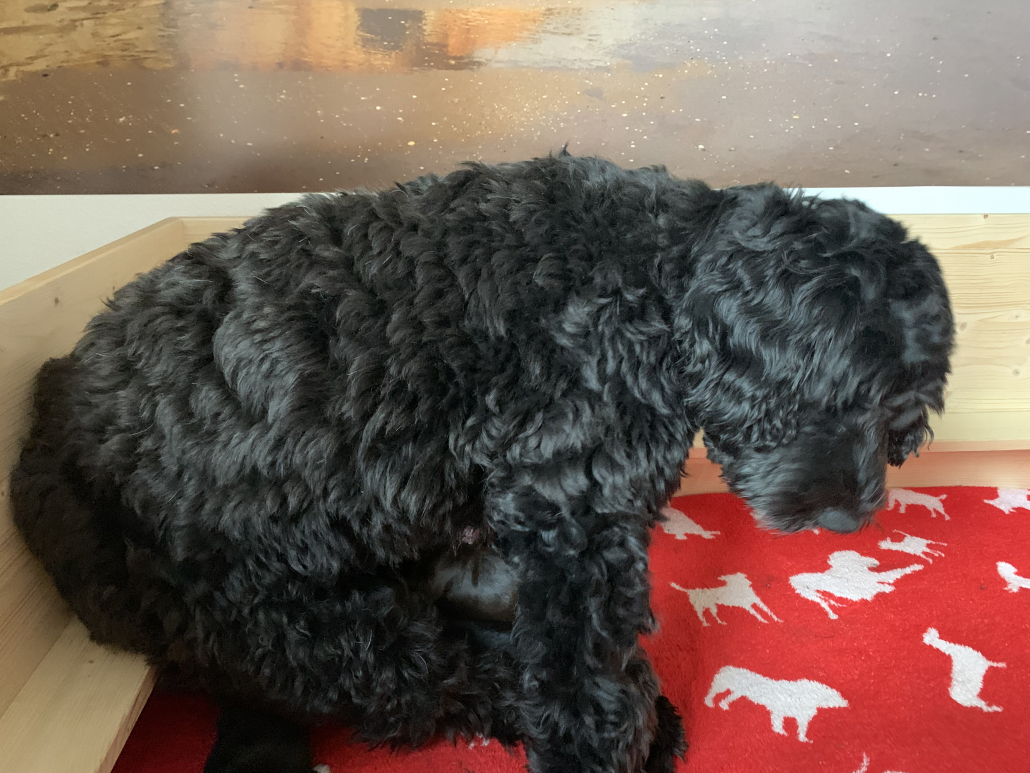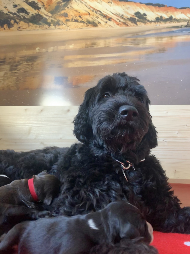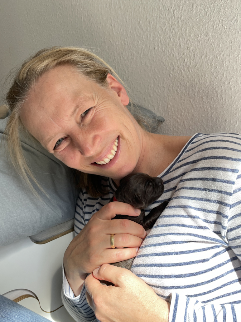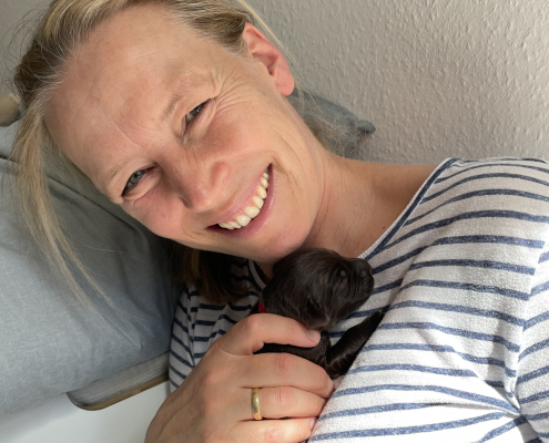 Lola nimmt sich nach wie vor ihre persönliche Auszeit nach dem Milch geben und kühlt sich gerne auf der Terrasse liegend ab, ist aber auch schnell wieder in der Box, wenn die Kleinen anfangen zu fiepen. Sie hat lustige alternative Positionen beim Stillen gefunden, sitzt z. B mit ihrem Hintern auf den kleinen Rand der Box, so dass alle Zitzen frei in der Luft hängen. Trotzdem muss man ein wenig darauf achten, dass auch alle Neune bei acht Zitzen ausreichend Milch bekommen. Die Natur ist da ja gnadenlos, die Kräftigen kämpfen sich immer durch, die Kleineren haben schnell das Nachsehen. Deswegen nehmen wir die Zarteren später nochmal raus, damit sie ihre Extraportion ganz in Ruhe außerhalb der Box genießen können – ohne den Druck der Konkurrenz.