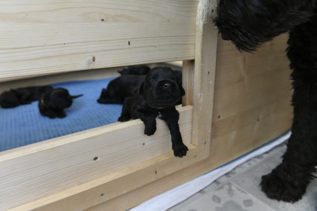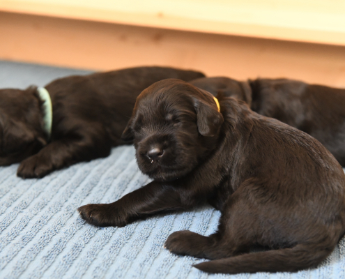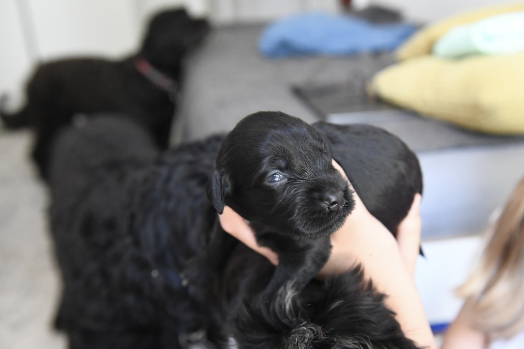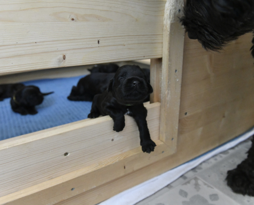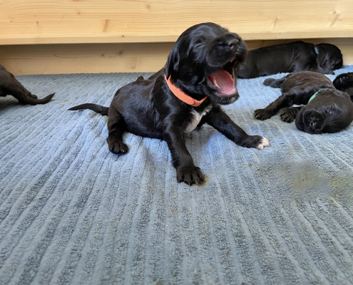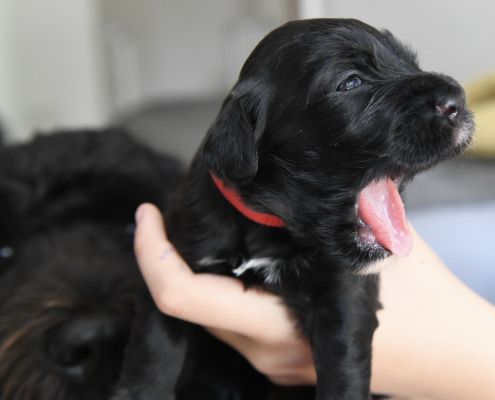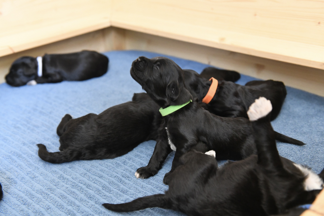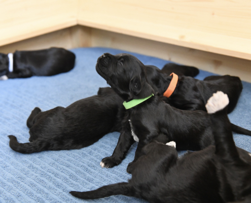 Am 13. Tag war es soweit. Morgens beim Säubern der Kiste und Wechseln der Tücher nimmt man die Kleinen beiseite – und unverrichteter Dinge „schaut“ einen der Erste an! Unglaublich, es ist ja zunächst nur ein kleiner Schlitz, hinter dem man ein glänzendes Etwas sieht, aber es ist so berührend, dass einem vor Freude fast die Tränen kommen. Auch wenn die Welpen zunächst nur wenig erkennen, und sicherlich noch nicht mein Gesicht betrachten, auch wenn man den Eindruck hat, dass sie einem natürlich tief in die Augen sehen, ist es sehr anrührend!