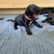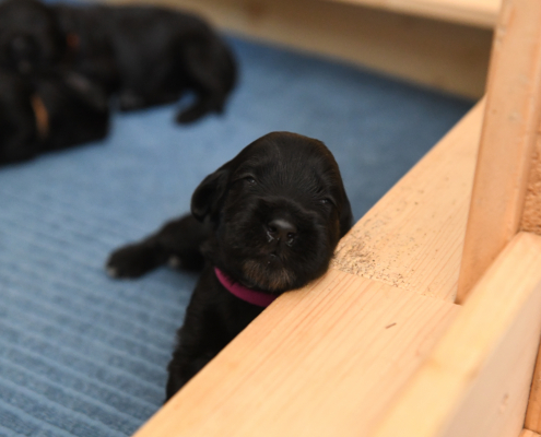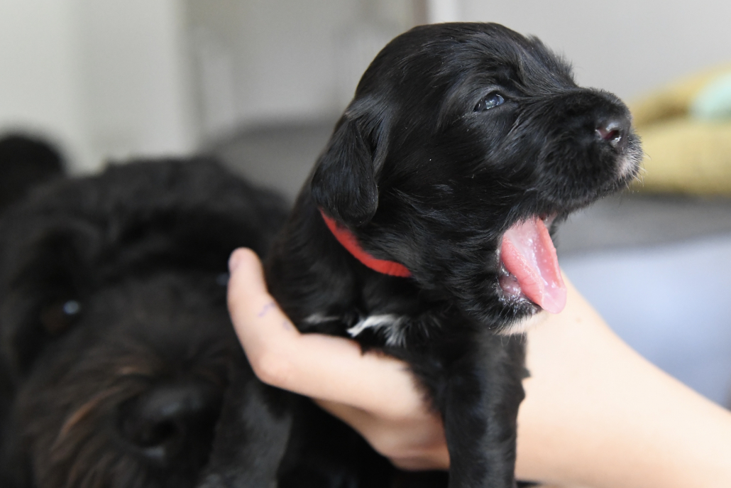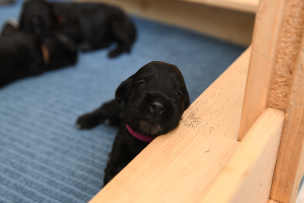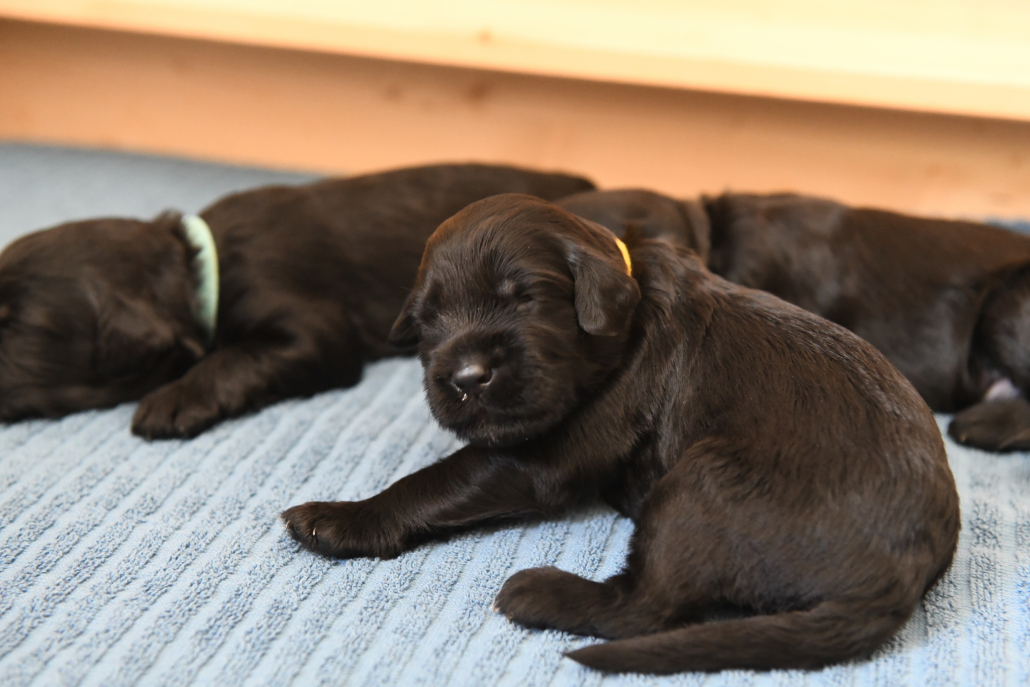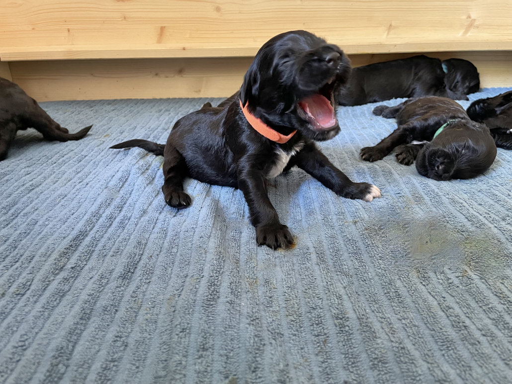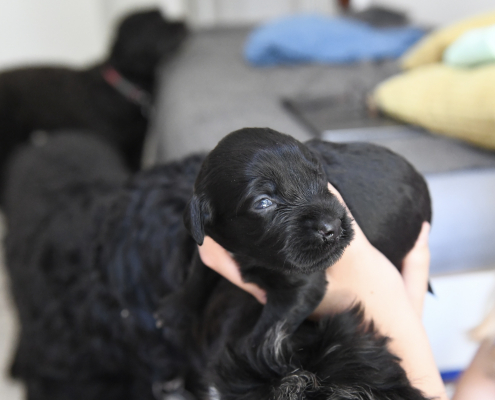 Am 13. Tag war es soweit. Morgens beim Säubern der Kiste und Wechseln der Tücher nimmt man die Kleinen beiseite – und unverrichteter Dinge „schaut“ einen der Erste an! Unglaublich, es ist ja zunächst nur ein kleiner Schlitz, hinter dem man ein glänzendes Etwas sieht, aber es ist so berührend, dass einem vor Freude fast die Tränen kommen. Auch wenn die Welpen zunächst nur wenig erkennen, und sicherlich noch nicht mein Gesicht betrachten, auch wenn man den Eindruck hat, dass sie einem natürlich tief in die Augen sehen, ist es sehr anrührend!