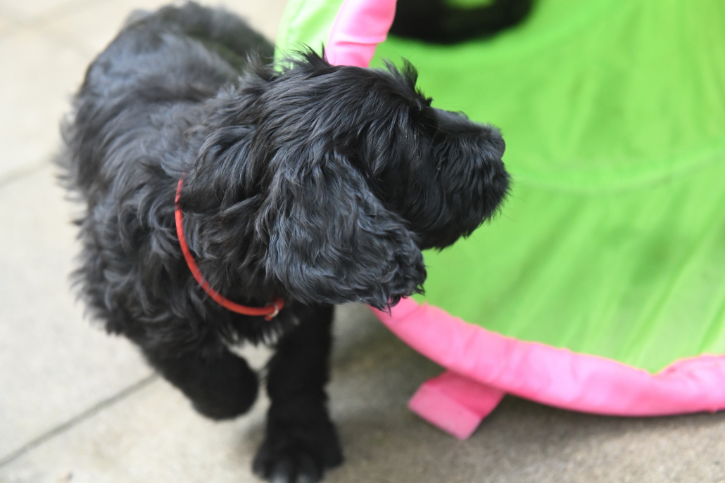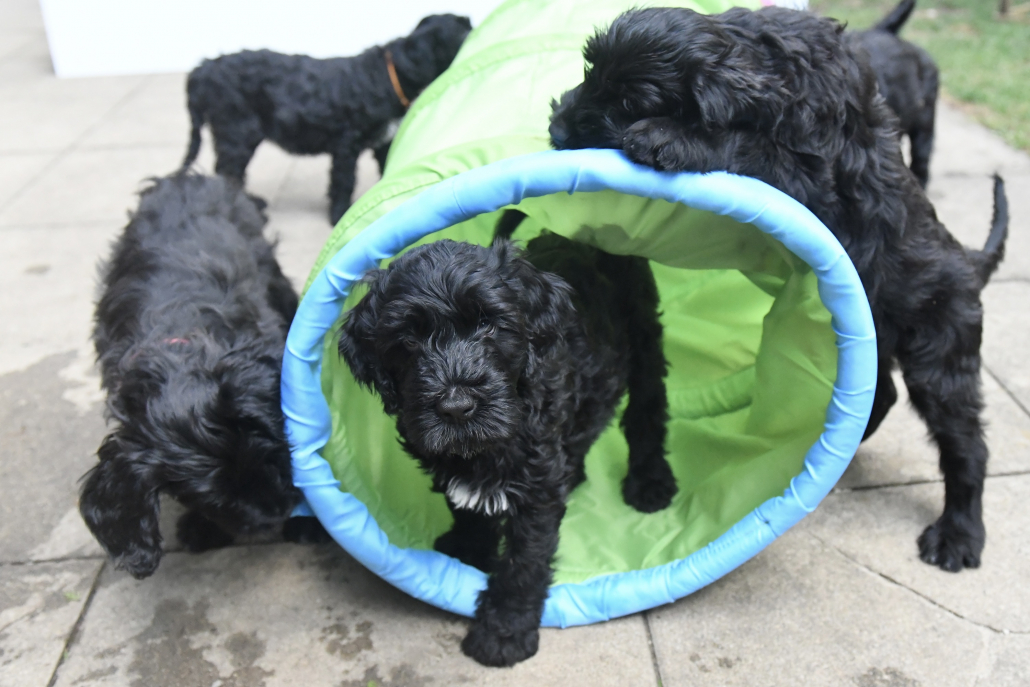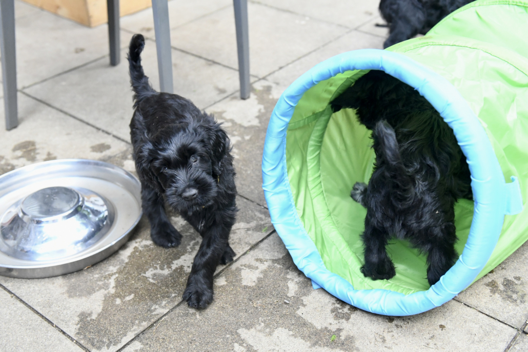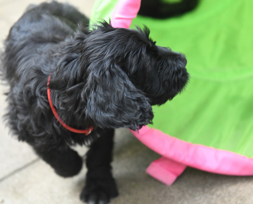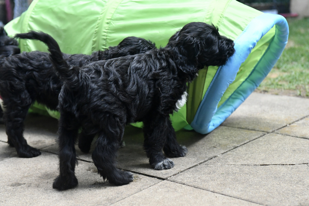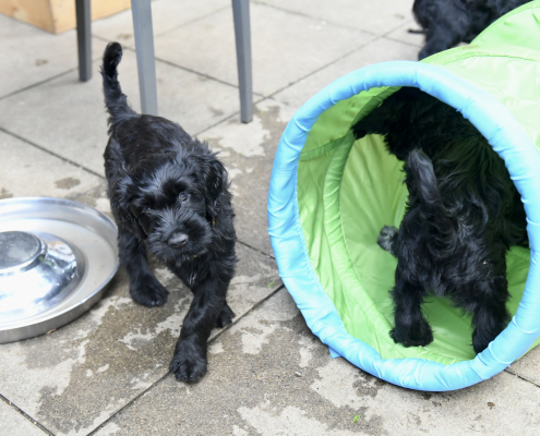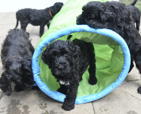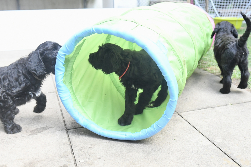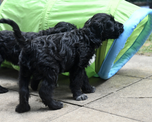 Das Auspacken des Spieltunnels war natürlich der Hit! Neugierig wird er von innen und außen erkundet, das Durchlaufen bereitet gar keine Furcht. Ein herrliches Schauspiel da zu zusehen! Das Ganze ist schon über eine Woche her, ich kam nur nicht zum Verarbeiten des Filmmaterials und zum Schreiben, denn das Ende der Welpenzeit bei uns naht unausweichlich. Vor ein paar Tagen war auch die Tierärztin da und hat alle untersucht, geimpft und den Chip implantiert, somit haben alle jetzt auch einen EU-Heimtierausweis! Es ist wirklich kaum zu fassen, dass jetzt schon die Zeit der Abgabe kommt. Vor 2 Tagen mussten wir uns schon von unserer ersten Hündin trennen. Sissi heißt jetzt Ida und wohnt in Hannover! Die Fahrt dorthin hat sie sehr entspannt gemeistert und lebt sich schon wunderbar ein. Es ist aber auch ein tolles neues Heim, in der sie mit Liebe überschüttet wird (nur Henry, ihr Cockapoo, muss sich wohl noch ein wenig an die neue Hundegesellschaft gewöhnen 😉 ….